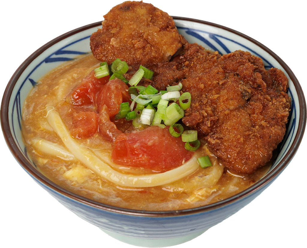Fresh udon in mild curry with tomato and egg, crowned with crispy chicken katsu.
