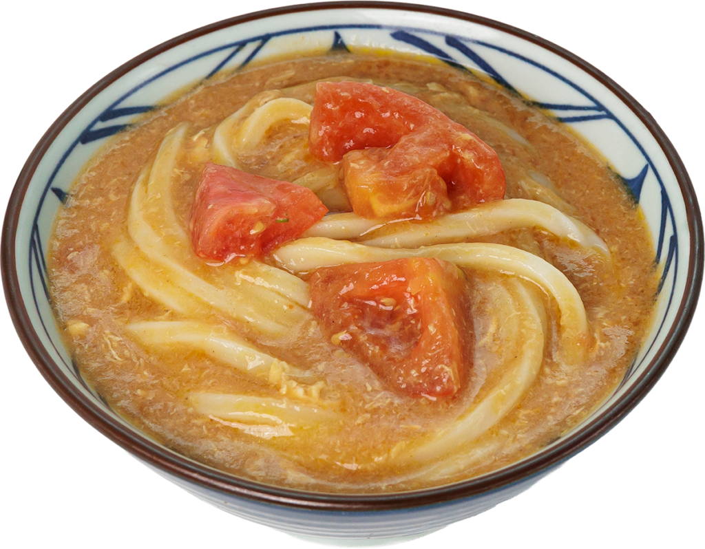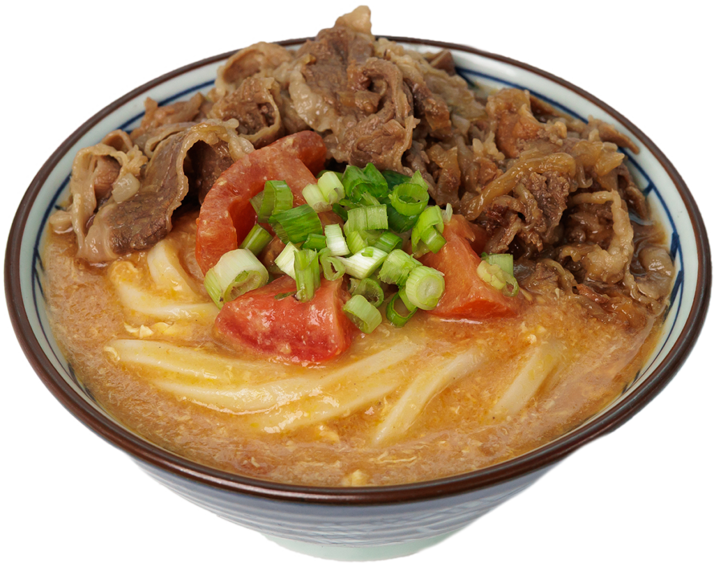 Fresh udon in mild curry with tomato and egg, topped with tender beef.